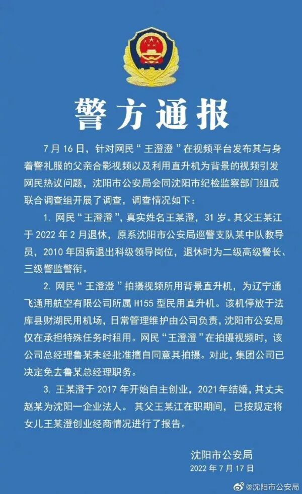 刚刚,沈阳警方通报:王某澄所用背景直升机为民用直升机,沈阳市公安局仅在承担特殊任务时租用。王在拍摄视频时,该公司总经理鲁某未经批准擅自同意其拍摄。对此,集团公司已决定免去鲁某总经理职务。父亲原系沈阳市公安局巡警支队某中队教导员,已退休。
