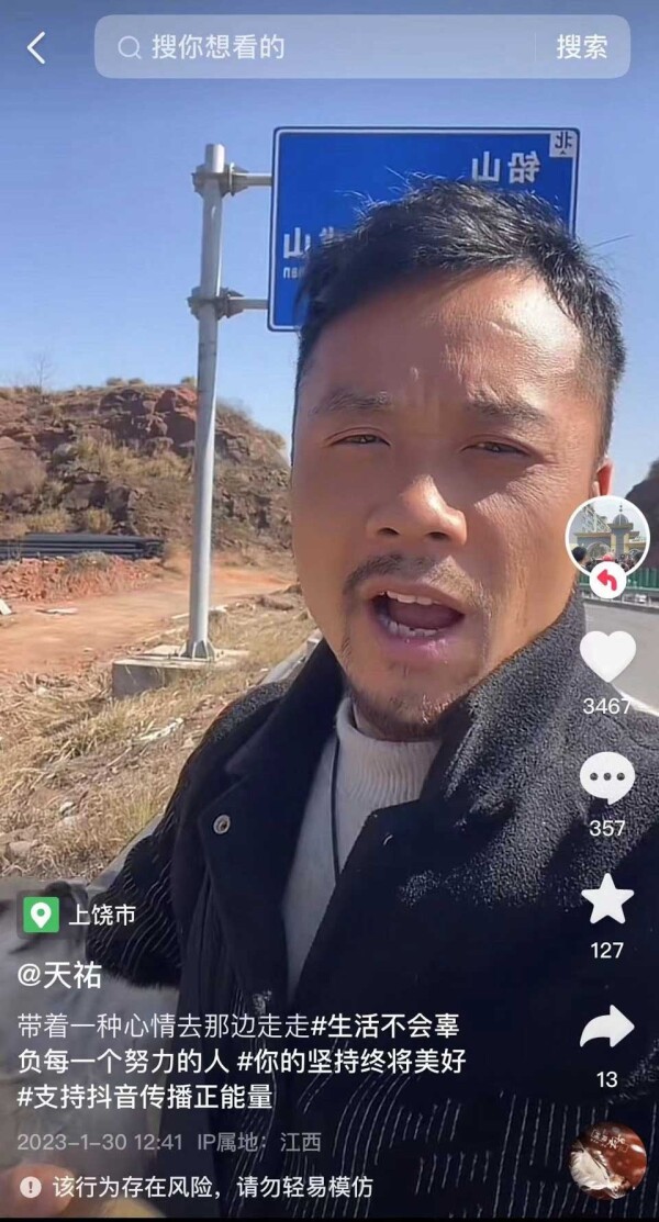 2023年1月30日,天祐在前往铅山的公路附近直播。(网络截图/图)