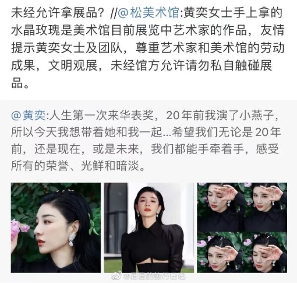 美术馆官微就直接评论,指出黄奕手中的水晶玫瑰是美术馆目前正在展览中的艺术家作品,并提醒黄奕和团队,尊重艺术家和美术馆的劳动成果,文明观展,未经馆方允许请勿私自触碰展品。场面十分尴尬。