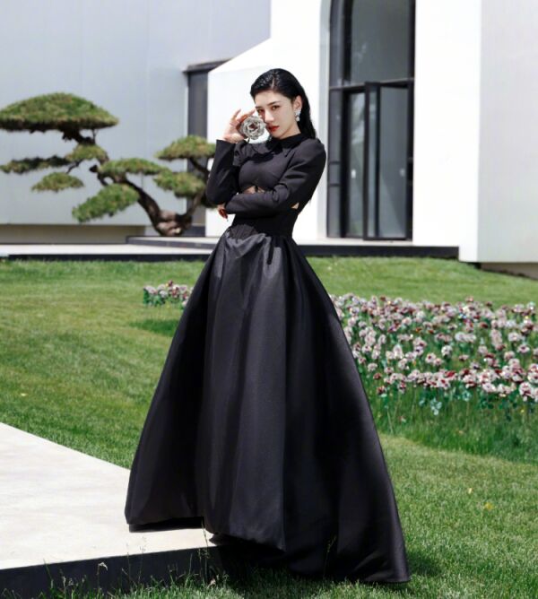 黄奕当天身穿黑色套裙,搭配干练有型的发型,整体非常有气场。但是问题就出在黄奕手拿的拍摄道具上,根据背景看,黄奕这一组图是在某美术馆拍摄,美术馆的建筑风格和场地植被都是经过场馆人员精心设计,非常具有艺术气息。