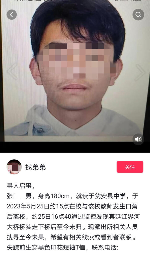 连日来,网友“找弟弟”在抖音发布消息称,贵州瓮安县惠仁中学一高中生于5月25日在校与教师发生口角后离校,后来在一大桥下桥后失联,至今已4天。