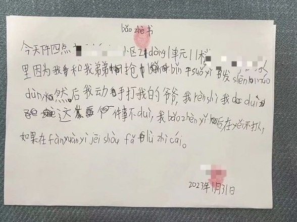 “这是你第几次与爷爷发生矛盾,为什么要和爷爷动手,你知不知道打人是违法的行为,如果把爷爷打伤了怎么办?”民警先是告知男孩打人的严重性,待他意识到错误后,又教育男孩:“无论有什么想法,你都要表达出来,对爷爷动手肯定是不对的。你是一个小男子汉了,有想法或者委屈就要光明磊落表达,我相信你的爷爷和爸爸妈妈都会理解的。”民警一番刚柔相济的教育后,小男孩慢慢低下了头,随后在民警的指导下写下了改过承诺书。