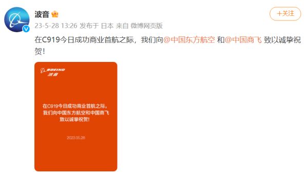 据波音公司官方微博28日消息:在C919今日成功商业首航之际,我们向中国东方航空和中国商飞致以诚挚祝贺!