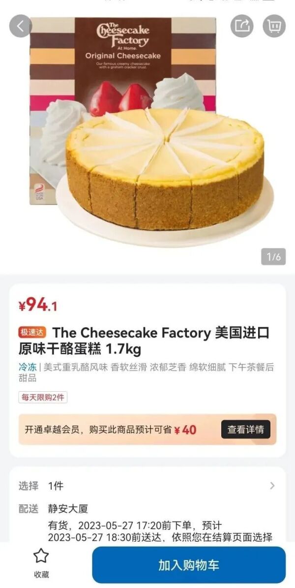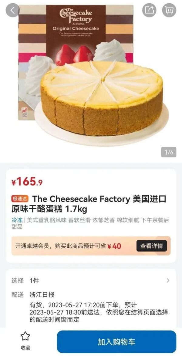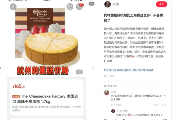 导读:近日,有网友在社交平台上发帖称在山姆超市app内,一款美国进原味干酪蛋糕在杭州地区售卖价格为165.9元,而同产品在上海地区的价格为95.1元。