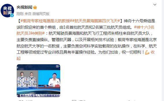 导读:神舟十六号乘组是该阶段迎来的首个乘组,由1名首批航天员和2名第三批航天员组成。载荷专家桂海潮是北京航空航天大学的一名教授。