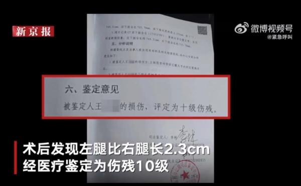 2022年11月,王女士在家摔伤左腿导致骨折,花3万元到长江骨科医院做了全髋关节置换手术,术后发现,左腿比右腿长2.3厘米,经医疗鉴定为伤残十级。