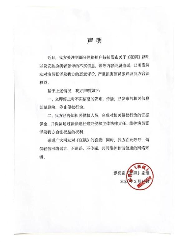 面对一些网络上的传言,《狂飙》剧组也是出面辟谣,发布声明,称最近的一些信息均为不实信息,这些内容纯属造谣,对于这些严重损害张译和剧组的言论,他们会拿起法律武器维护自己的权益,更是称请大家不要相信谣言,共同维护网络环境。
