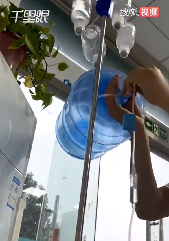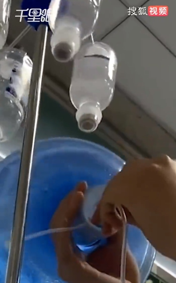 视频显示,一名男子说道:“挂这个不好,我给你挂这个,能消除水肿,明天起来胖胖的。”随即,该男子将插入药瓶的针头拔下,插入水桶中。不过,该该男子手持的水桶是空的,里面基本没有水。