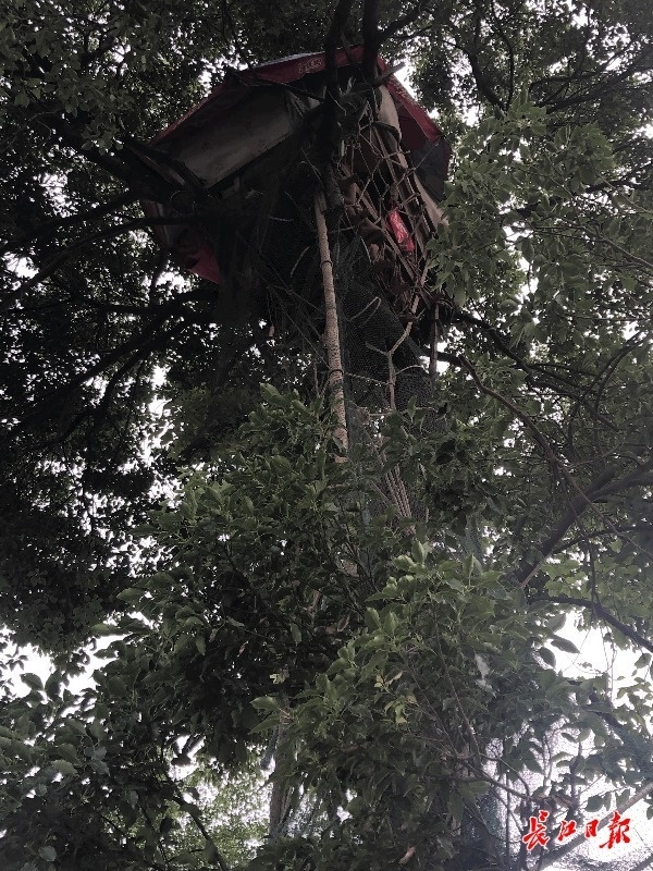 导读:一位大叔住在约9米高的樟树上,引发网友好奇。这位大叔叫张德明,为了能随时照顾田地和家禽,他在樟树上搭了个棚子,晴天的时候就住在上面。