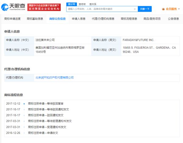天眼查App显示,“FF91”已被多方申请注册商标,申请人包括法拉第未来公司以及多家服饰、科技公司和自然人,国际分类涉及运输工具、广告销售、餐饮住宿等。其中,法拉第未来公司申请的运输工具类“FF91”商标于2017年被驳回复审,现为无效状态,自然人孙某某则已成功注册广告销售类“FF91”商标,其余申请人申请的商标也多被驳回。