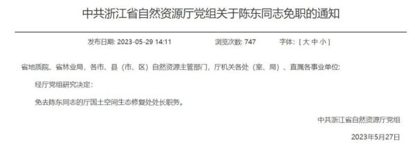 5月30日,网上流传的两张截图引发关注,一张是“浙江省自然资源厅免去陈东同志的厅国土空间生态修复处处长职务”的通知。通知发布时间为5月27日。