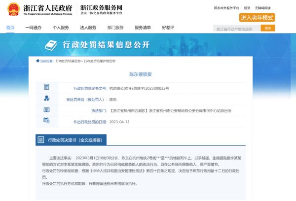 处罚决定书显示,2023年3月1日18时30分许,陈东在杭州地铁2号线的地铁列车上,以手触碰、生殖器贴蹭李某某臀部的方式,对李某某实施猥亵。陈东的行为已经构成猥亵他人的违法行为,且在公共场所猥亵他人,属严重情节。根据《中华人民共和国治安管理处罚法》第四十四条之规定,决定给予陈东行政拘留十二日的行政处罚。行政拘留送杭州拘留所执行。