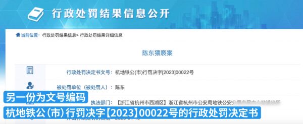 另一张截图为一份行政处罚决定书。处罚决定书显示陈东因猥亵被杭州地铁处罚。
