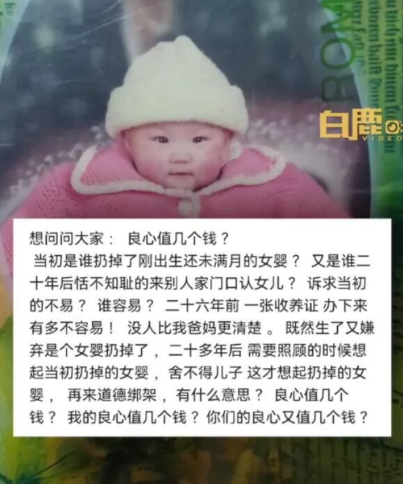 据白鹿视频报道,近日,江苏东台一女子称,亲生父母因她是女孩,出生时将其抛弃,19岁时对方找来相认,自己拒绝后遭到对方谴责。