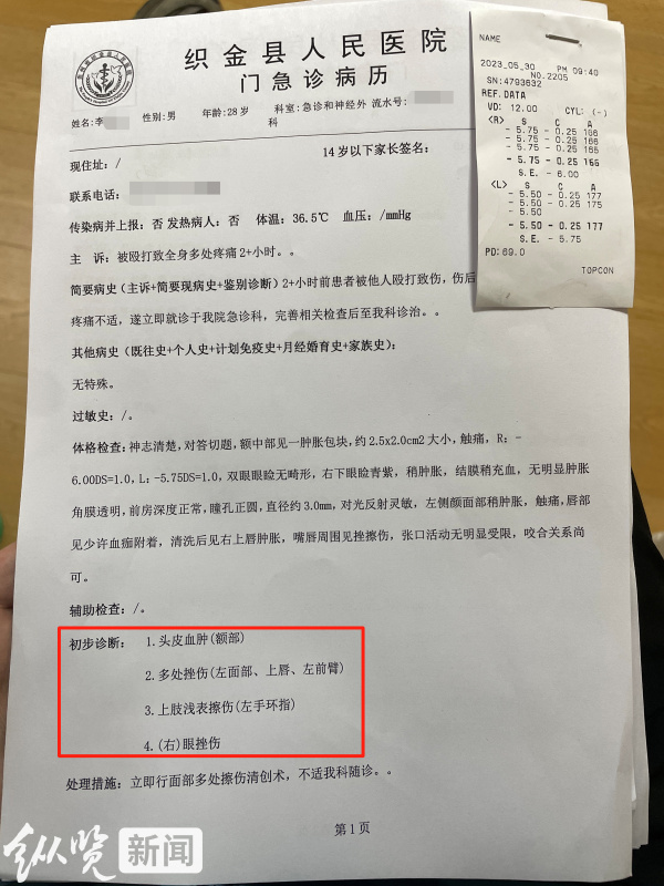 上述知情人士表示,被围殴过程中,该记者没有还手,只用双手护住头部。根据织金县人民医院出具的病历资料显示,患者被殴打致全身多处疼痛超过两小时。初步诊断为:头皮血肿(额部)、多处挫伤(左面部、上唇、左前臂)、上肢浅表擦伤(左手环指)、(右)眼挫伤。