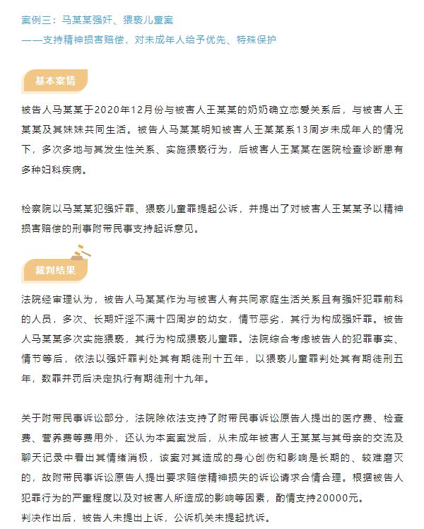 太原中院认为,该案的典型意义在于除给予受性侵害未成年人人身损害和心理康复治疗等直接物质损失的赔偿外,给予一定的精神损害赔偿,更能体现对未成年人优先、特殊保护的原则。