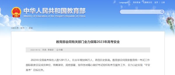 6月1日,据教育部网站:2023年全国高考报名人数1291万人,比去年增加98万人,再创历史新高。教育部会同国家教育统一考试工作部际联席会议成员单位,统筹谋划,周密部署,指导各地精心做好考试组织和考生服务工作,全力以赴实现“平安高考”目标任务。