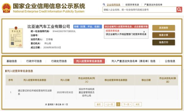 导读:5月30日,比亚迪汽车工业有限公司因通过登记的住所或经营场所无法联系,被深圳市市场和质量监督管理委员会坪山局列入经营异常名录。