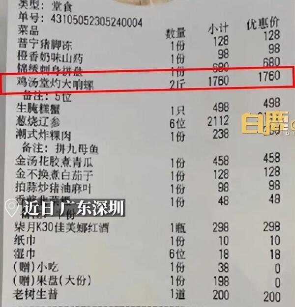 “我想着点了就点了呗,几百块钱的菜,更何况他也知道什么菜好吃。”陈女士表示,上菜后,自己发现大部分菜都是家常菜,只有响锣和海参稍微值点钱,但也不是很贵。