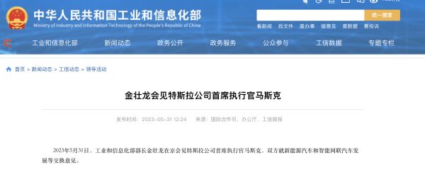 5月31日早前,工业和信息化部部长金壮龙在京会见特斯拉公司首席执行官马斯克,双方就新能源汽车和智能网联汽车发展等交换意见。