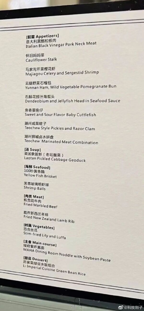 根据网传菜单,马斯克到访后的首次晚宴共有16道菜,分为前菜、汤、海鲜、肉类、时蔬、主食、甜品七大类,包括意大利黑醋松板肉、怀旧妈妈菜、马家沟芹菜樱花虾、美国象拔蚌(老坛酸菜)等,“压轴”主食则是炸酱面。