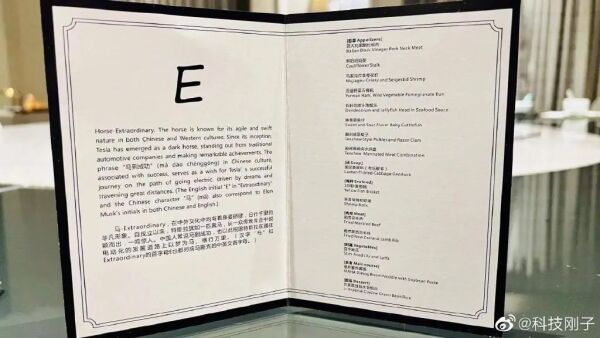 值得一提的是,在网传菜单的封面上,两匹马占据了大部分空间,寓意着特斯拉在电动化领域“驰骋千里、梦想成真”的祝福。菜单内页字母“E”十分醒目,并用中英双语介绍了“马”的含义,以及祝愿特斯拉在通往电动化的发展道路上以梦为马、横行万里。而汉字“马”和Extraordinary的首字母E对应了马斯克的中英文名字的首字和首字母。
