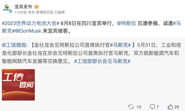2023世界动力电池大会将于6月8日在四川宜宾举行,特斯拉应邀参展。正当马斯克访华之际,5月31日,宜宾发布官方微博发文,诚邀马斯克来宜宾做客。