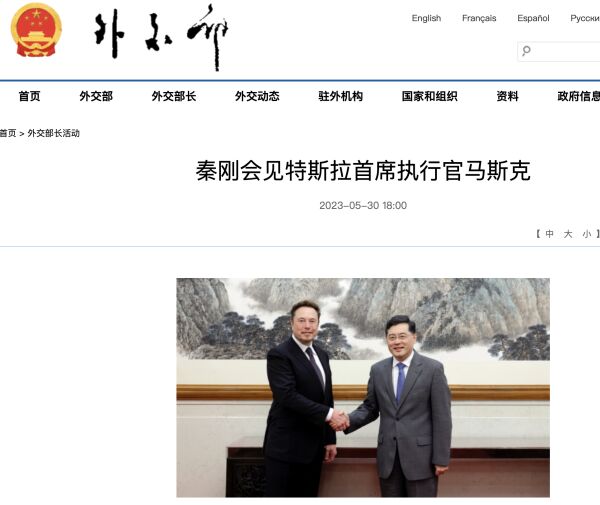 据外交部网站5月30日18点消息,2023年5月30日,国务委员兼外长秦刚在北京会见特斯拉首席执行官马斯克。