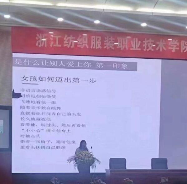 导读:近日,网传浙江某职业技术学院向大一女生开展“青春健康教育”讲座,老师向女孩们介绍“第一印象如何让别人爱上你”。学校:正在调查,是校外请的专家。