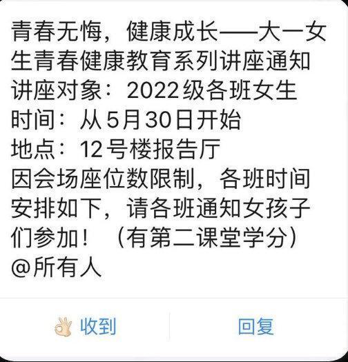 6月1日,有网友爆料,浙江纺织服装职业技术学院近日面向大一新生开展“女性青春健康教育”讲座,教导女生如何吸引男性,引发广大学生不适。