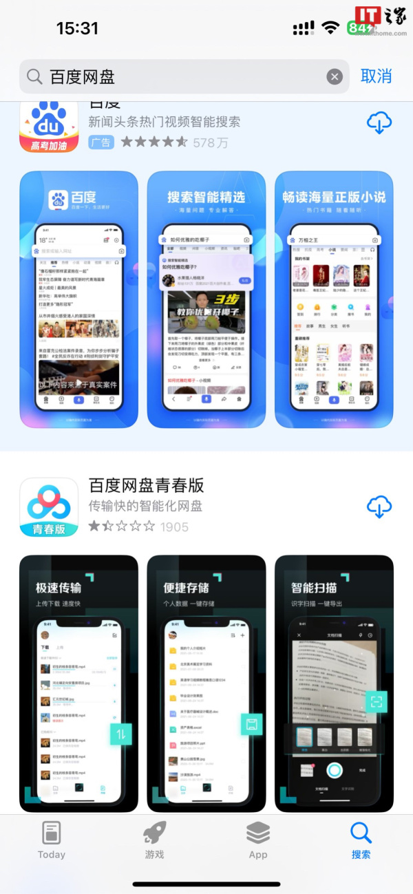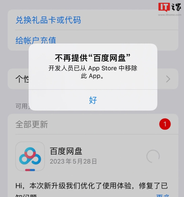 IT之家 6 月 1 日消息,据多名IT之家网友反馈,苹果 App Store 搜索及页面显示,百度网盘 App 已经从苹果 App Store 应用商店下架,弹窗显示“不再提供百度网盘,开发人员已从 App Store 中移除此 App”。