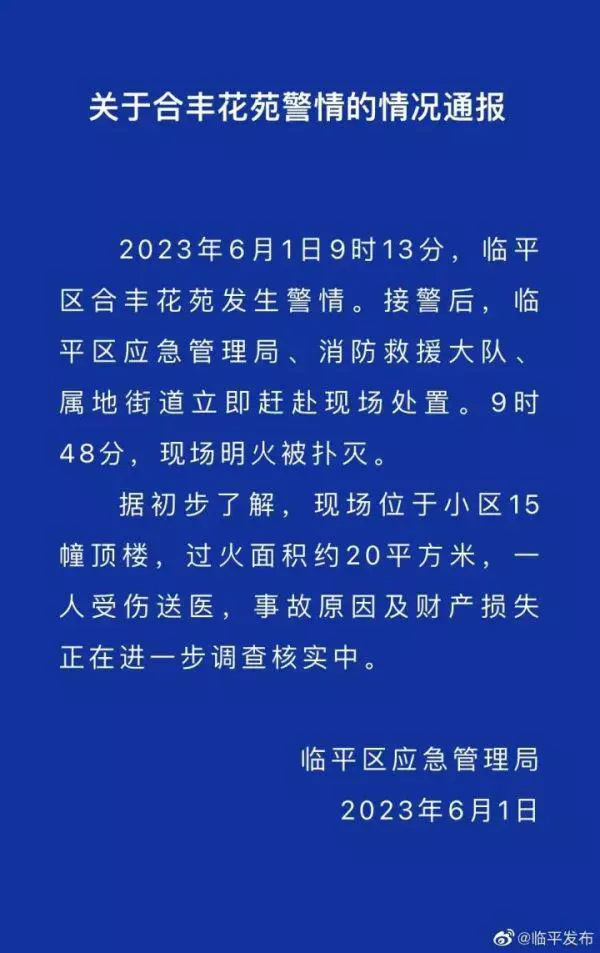 随后,杭州临平区应急管理局发布警情通报:据初步了解,现场位于小区15幢顶楼,过火面积约20平方米,一人受伤送医,事故原因及财产损失正在进一步调查核实中。