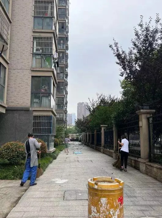 记者在小区内走访发现,距离事发楼栋五六十米外的小区人行通道中,有不少玻璃碎片。“这就是那幢楼里炸出来的。”一位小区居民指着玻璃碎片说。