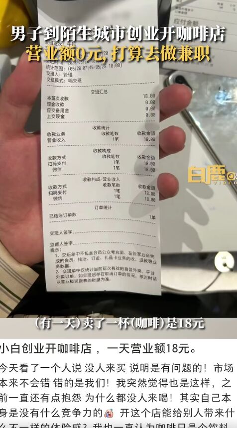 6月1日,据白鹿视频报道,近日,上海一男子拿15万元积蓄赴杭州开咖啡店日入0元,引起广泛关注。