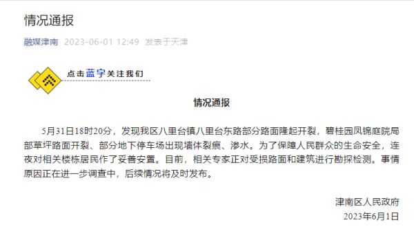 5月31日18时20分,发现我区(天津市津南区)八里台镇八里台东路部分路面隆起开裂,碧桂园凤锦庭院局部草坪路面开裂、部分地下停车场出现墙体裂痕、渗水。为了保障人民群众的生命安全,连夜对相关楼栋居民作了妥善安置。目前,相关专家正对受损路面和建筑进行勘探检测。事情原因正在进一步调查中,后续情况将及时发布。