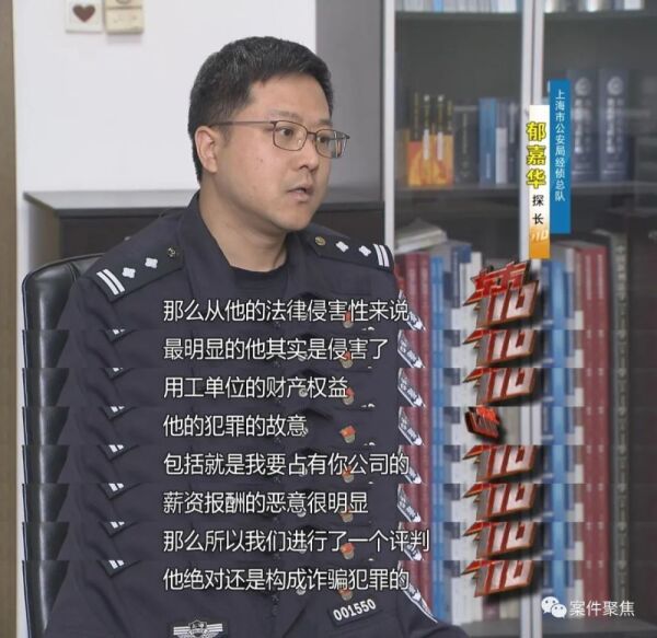 探长 郁嘉华:从他的法律侵害性来说,最明显的,他其实是侵害了用工单位的财产权益。他的犯罪的故意,包括占有公司的薪资报酬的恶意很明显,那么我们进行了一个评判,绝对构成诈骗犯罪。
