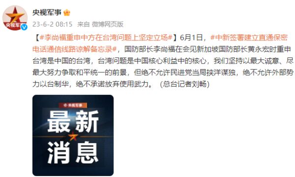 6月1日,中新签署建立直通保密电话通信线路谅解备忘录,国防部长李尚福在会见新加坡国防部长黄永宏时重申台湾是中国的台湾,台湾问题是中国核心利益中的核心,我们坚持以最大诚意、尽最大努力争取和平统一的前景,但绝不允许民进党当局挟洋谋独,绝不允许外部势力以台制华,绝不承诺放弃使用武力。(总台记者刘畅)