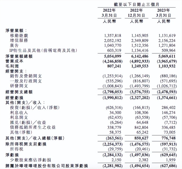 导读:6月1日,哔哩哔哩公司发布了截至2023年3月31日的一季度业绩报告。B站今年一季度的净亏损为6.296亿元,较2022年同期收窄72%。