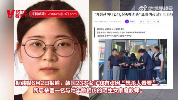 据顶端新闻援引Vista看天下:韩媒6月2日报道,韩国23岁女子郑有贞因“想杀人看看”,残忍杀害一名与她年龄相仿的陌生女家庭教师。