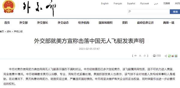 外交部网站2月5日消息,外交部就美方宣称击落中国无人飞艇发表声明:中方对美方使用武力袭击民用无人飞艇表示强烈不满和抗议。中方经核查后已多次告知美方,该飞艇属民用性质,因不可抗力进入美国,完全是意外情况。中方明确要求美方以冷静、专业、克制方式妥善处理。美国防部发言人也表示,该气球不会对地面人员构成军事和人身威胁。在此情况下,美方执意动用武力,明显反应过度,严重违反国际惯例。中方将坚决维护有关企业的正当权益,同时保留作出进一步必要反应的权利。
