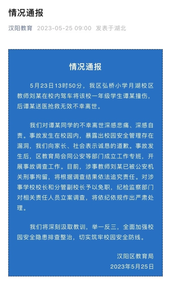 5月25日,武汉市汉阳区教育局发布情况通报称:“5月23日13时50分,我区弘桥小学月湖校区教师刘某在校内驾车将该校一年级学生谭某撞伤,后谭某送医抢救无效不幸离世。我们对谭某同学的不幸离世深感悲痛、深感自责。事故发生在校园内,暴露出校园安全管理存在漏洞,我们向家长、社会表示诚恳的道歉。事故发生后,区教育局会同公安等部门成立工作专班,开展事故调查工作。目前,涉事教师刘某已被公安机关刑事拘留,将根据调查结果依法追究责任。对涉事学校校长和分管副校长予以免职,纪检监察部门对相关责任人员立案调查,将依纪依规作出严肃处理。我们将深刻汲取教训,举一反三,全面加强校园安全隐患排查整治,切实筑牢校园安全防线。”