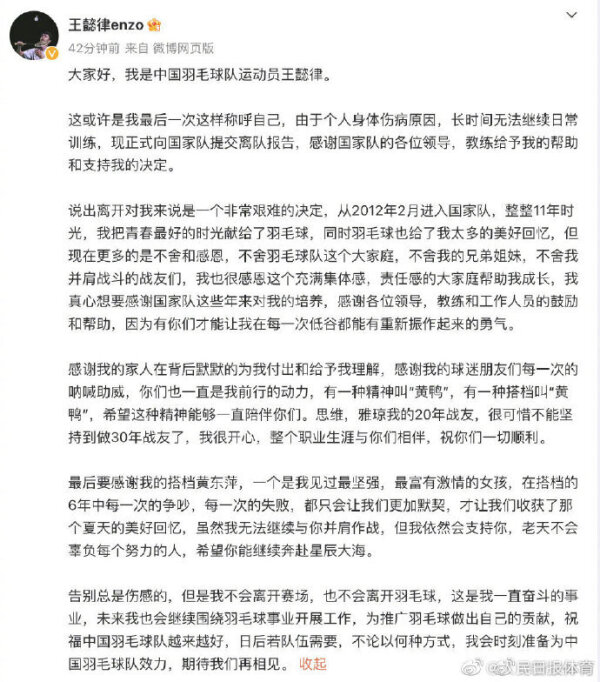 导读:6月3日消息,东京奥运羽毛球混双冠军王懿律发布长文,宣布退出国家队:说出离开对我来说是一个非常艰难的决定,祝未来一样精彩。