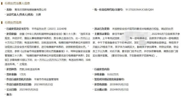处罚事由显示,2022年6月7日,平度市一小区业主孩子参加高考,中午回家发现该楼一部电梯停运,便乘另一部电梯上楼,下午下楼时发现两部电梯全部停运,导致其从29楼步行下楼,体力消耗巨大影响高考。向物业反映,员工不以为然,业主因此投诉,要求给予处罚,并尽快修复电梯,不影响孩子后期考试。