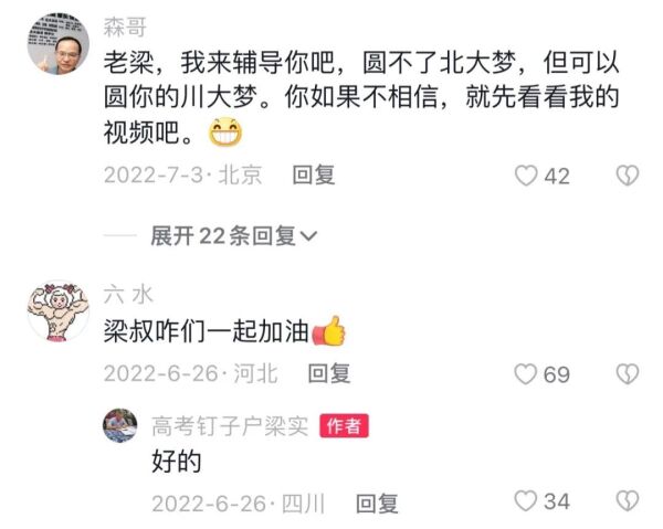 “父母是教师跟自己想考大学之间并无关系,只是觉得大学生很神气,以前一提起大学生就感觉好安逸哦。”梁实每当说起大学生的身份,就会佩服得五体投地。“感觉自己今年能考上,如果仍然考不上,后面的事情先不去考虑。”梁实对今年高考依然抱着乐观的态度。对于比自己小30多岁的同届考生,他也表示了很诚恳的祝福,“希望年轻的考生可以实现自己的人生目标,考取一个理想的成绩。”