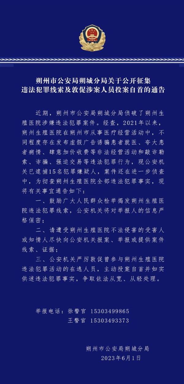 6月1日,朔州市公安局朔城分局在其微信公众号“平安朔城”发布《关于公开征集违法犯罪线索及敦促涉案人员投案自首的通告》,披露了朔州生殖医院在医疗经营活动中涉嫌敲诈勒索、诈骗、强迫交易等违法犯罪行为,目前公安机关已逮捕犯罪嫌疑人15名。