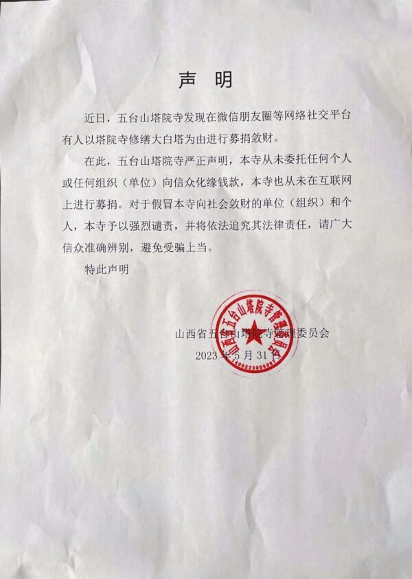 6月1日,山西省五台山佛教协会发布严正声明,称该文章内容为不实信息。