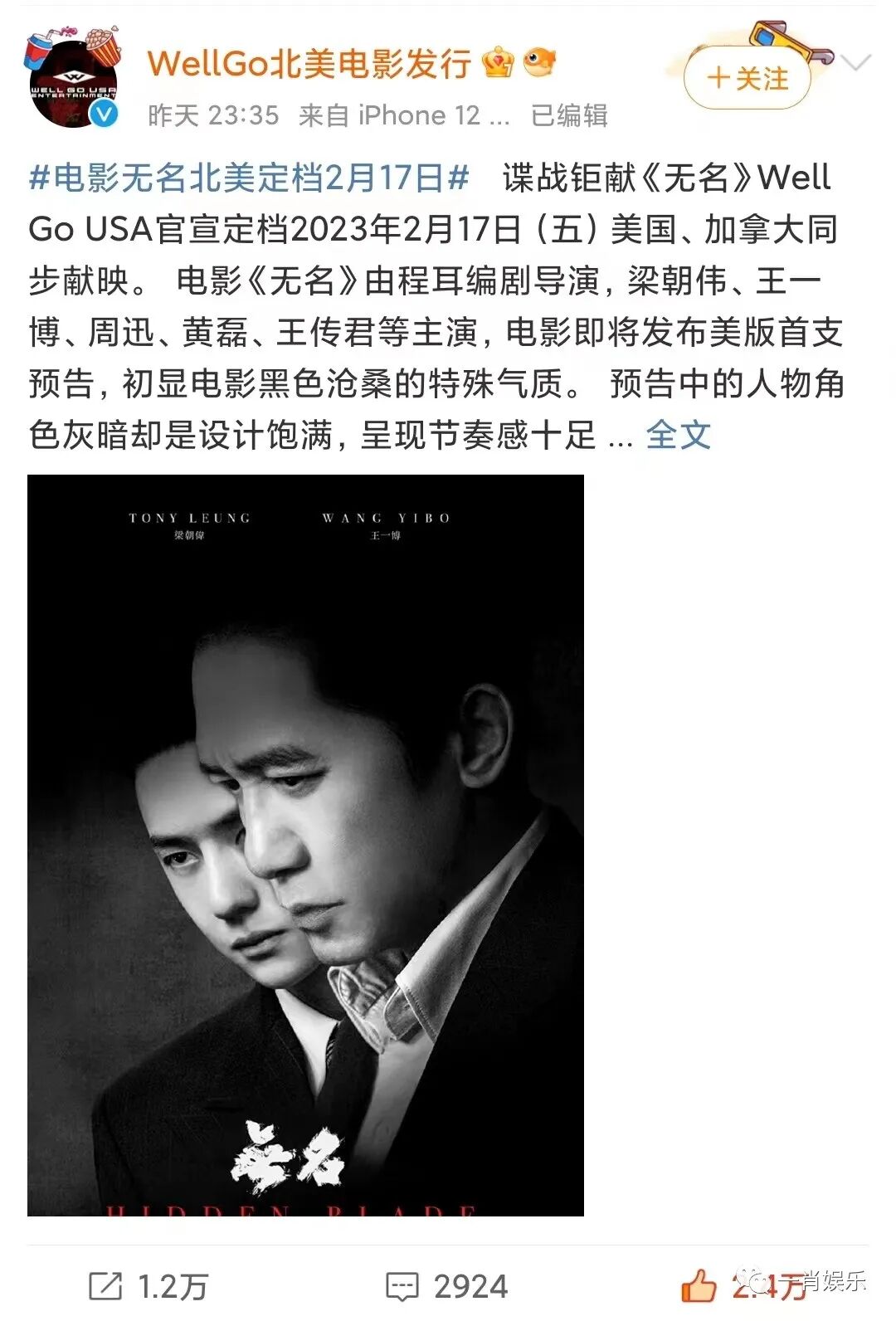 恭喜由梁朝伟、王一博主演的电影《无名》票房再创佳绩,官宣2月17日北美定档!