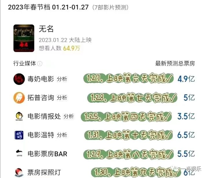 自从《无名》官宣定档后,被各种媒体,所谓的“路人”唱衰,猫眼媒体预测票房3.5-6.5亿,灯塔媒体预测票房也不过4.92-6.5亿,春节档7部电影,倒数第一。是粉丝想要逆天改命,冲预售要多点排片,所以在预售开启前几天都是第一,这是值得骄傲的,这是自带的票房保障,把粉丝转化为影迷更是演员的本事。《无名》也是唯一一部没有进行点映的春节档电影,即使排片不如意,但《无名》更相信影片的质量。《无名》上映第一天票房1.37亿,后续更是被有些人抹黑为“粉丝电影”,豆瓣评分6.8,《无名》也大大方方的贴在大字报上,《无名》是给观影人看的,好不好自有观众评判。