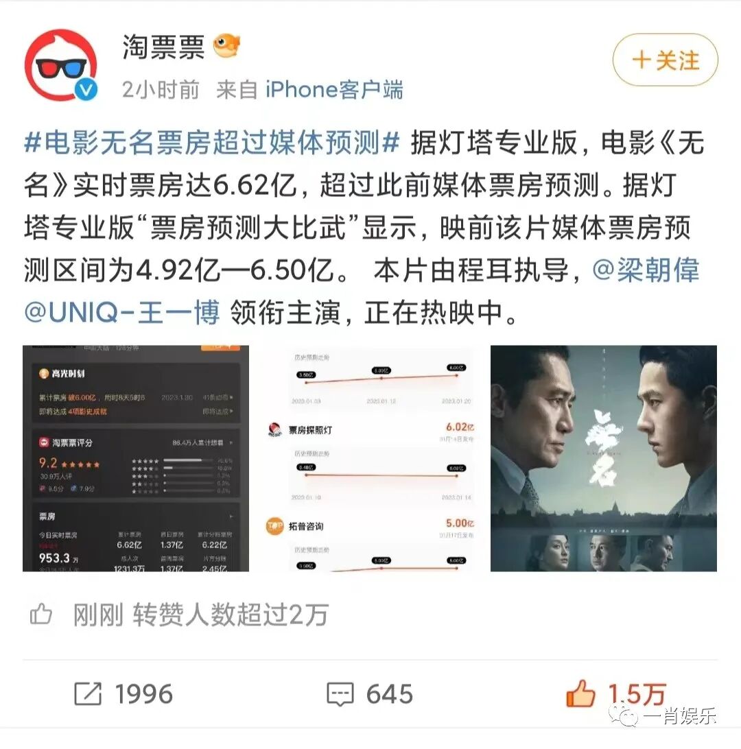 导读:近日,博纳影视表示梁朝伟、王一博主演的《无名》虽然在春节档6部电影里的预测票房排名倒数第一,但现已超出预期成绩,要分得清票房预测和票房预期。
