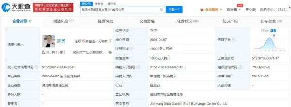 简阳市西部果蔬交易中心有限公司成立于2006年4月,注册资本1亿人民币,周震南父亲周勇为法定代表人,并间接持有100%股权,为疑似实际控制人。
